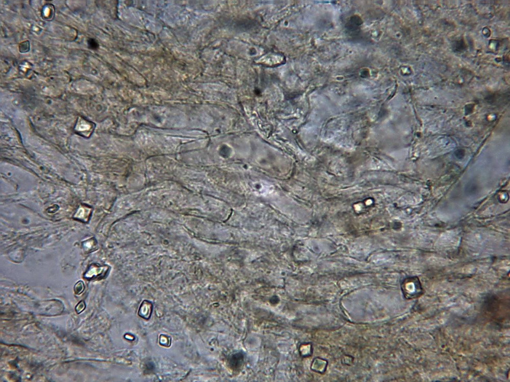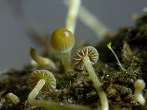 Hut bis 4 mm, 2/3 durchscheinend gerieft, Stiel bis 25/ - 0,8 mm, Lamellen, entfernt, Schneiden weiß, H.H. gelatinös, nicht abziehbar! Hutrand mit Velumresten, Pleurocystiden fehlen!