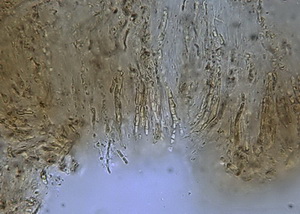 Sporen: 9.70 - 12.50 x 3.30 - 4.20 µ wahrscheinlich 2-3 Septen, Hyphen ohne Schnallen!,