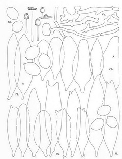 hat rundlich- eiförmige Sporen, 7,5 - 9,5 x 6,5 - 8,5 µm, Schnallen, kleinschollig- bis schuppiges Velum, |