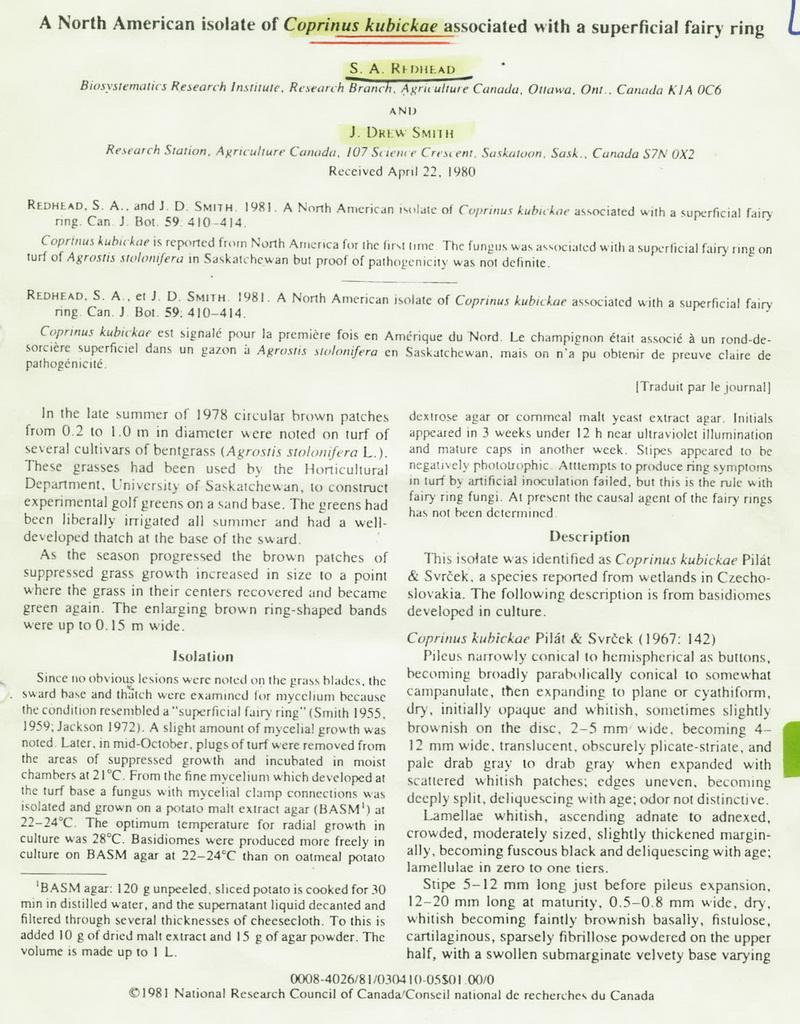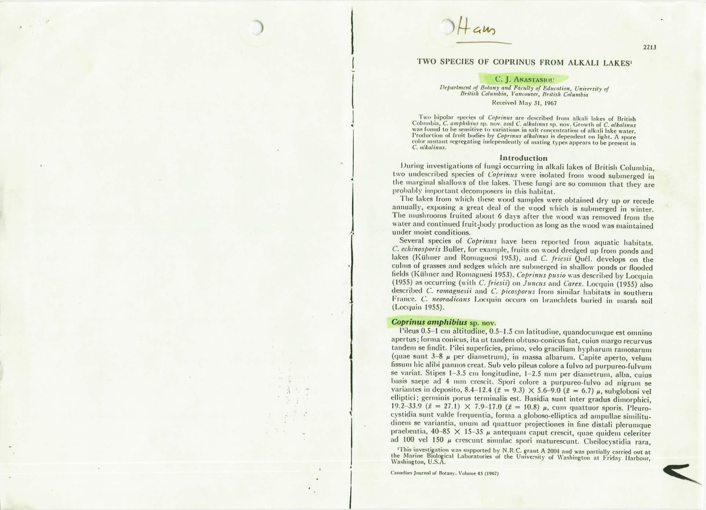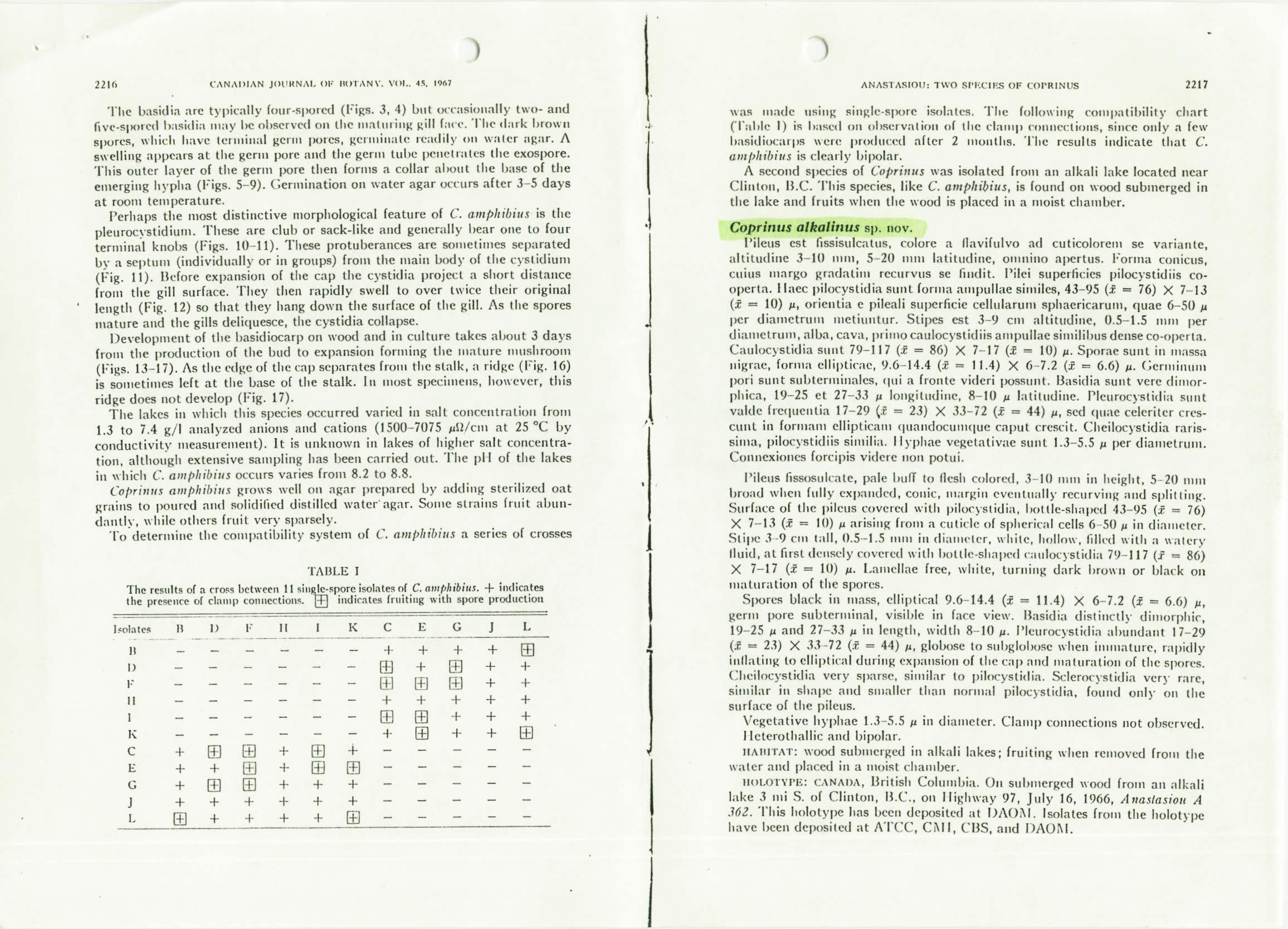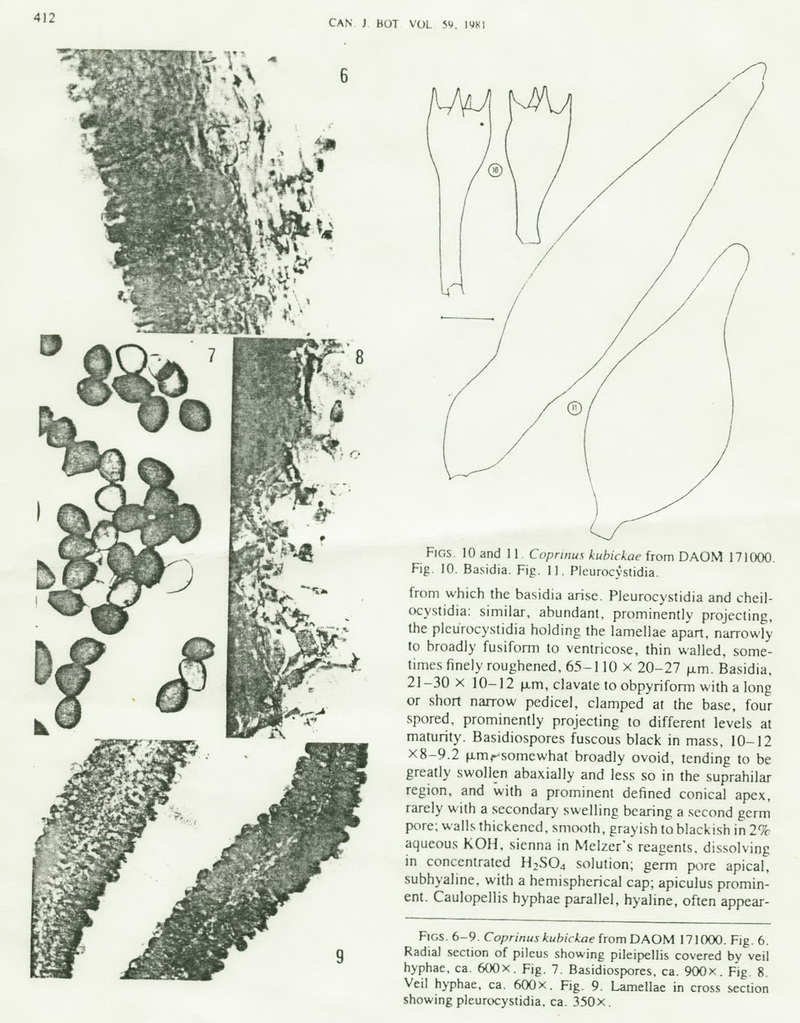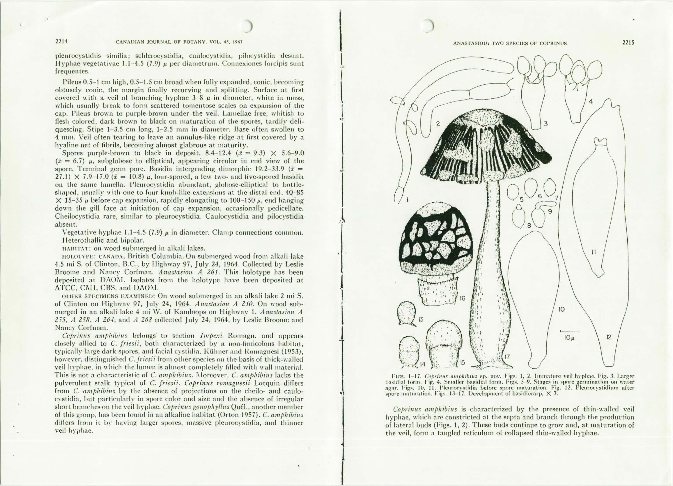Diese Beschreibung von Coprinopsis amphibius Anastasiot in Canadian Journal of Botany Vol. 45, 1967