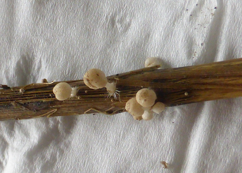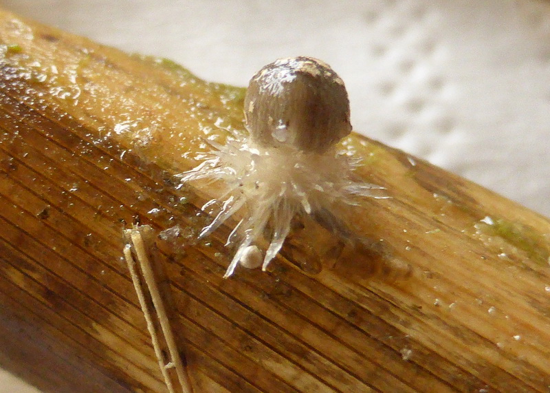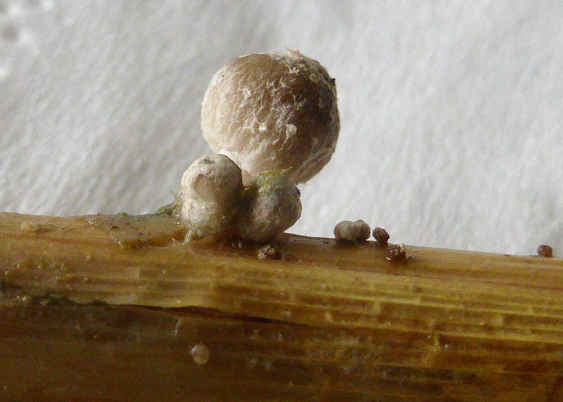 Diese Art wächst ebenfalls auf Schilfhalmen, hat aber deutlich breitere rundliche Sporen und wird in der Literatur als rundsporiger Tintling betitelt.