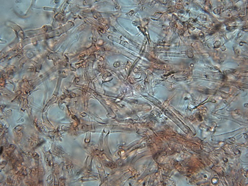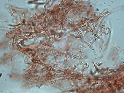 | Coprinopsis spec. | hat eiförmig- ovale Sporen, schollig- felderiges, filziges Velumauf dem Hut. Es sind in allen Teilen Schnallen vorhanden. |